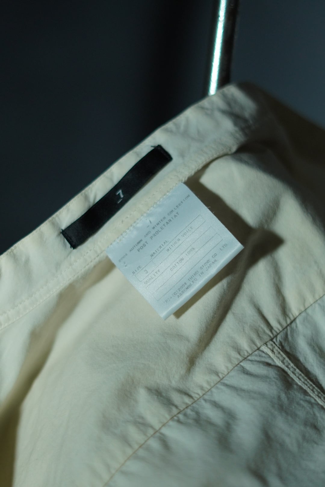 JULIUSのアーカイブから、2004AWコレクション「POST PROLETARIAT」のバンドカラーシャツが入荷。ミニマルながら立体的なパターン設計と、敢えてのバンドカラー仕様により、構築性と静謐さが同居する一着です。艶を抑えたやや生成りのコットンが、都市的かつ内省的なムードを醸し、JULIUS特有の“沈黙の中の意志”を感じさせる仕上がりに。