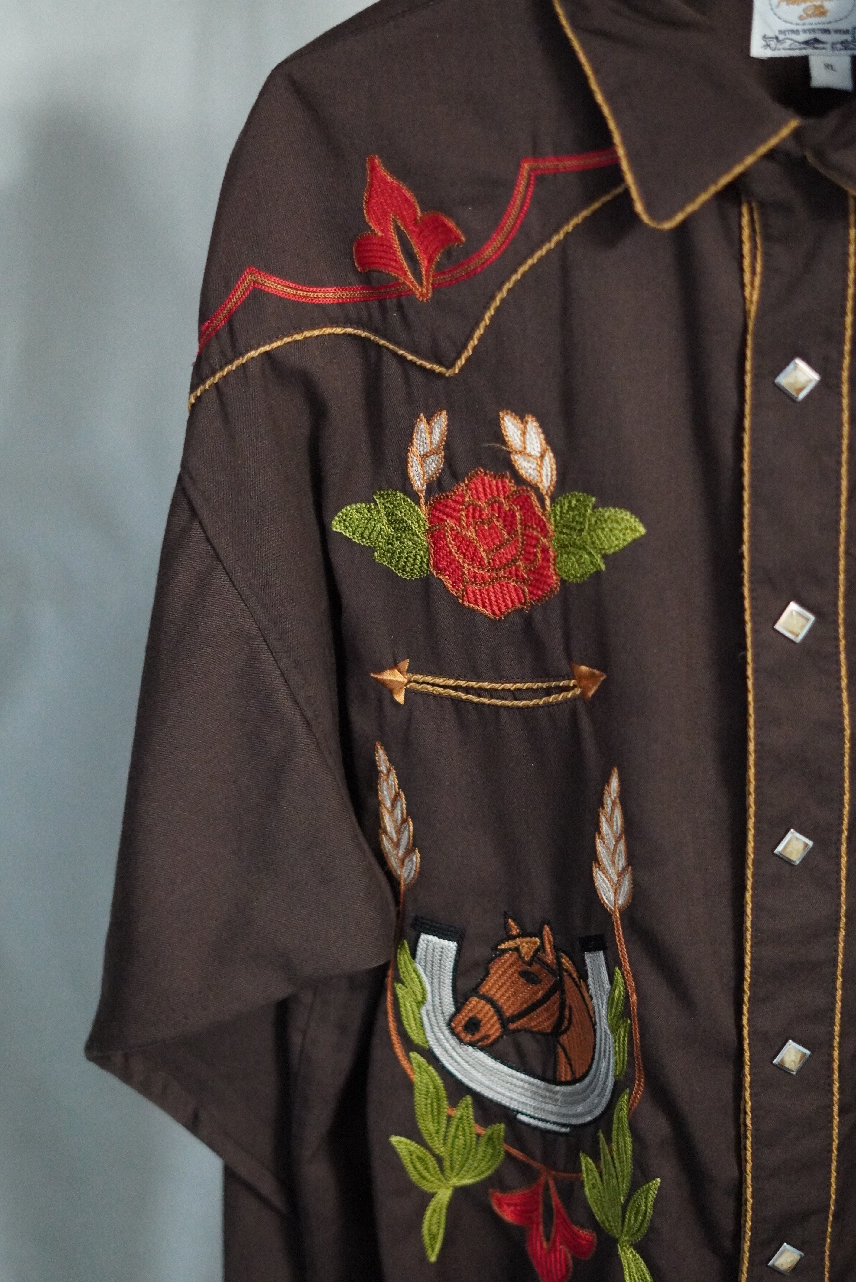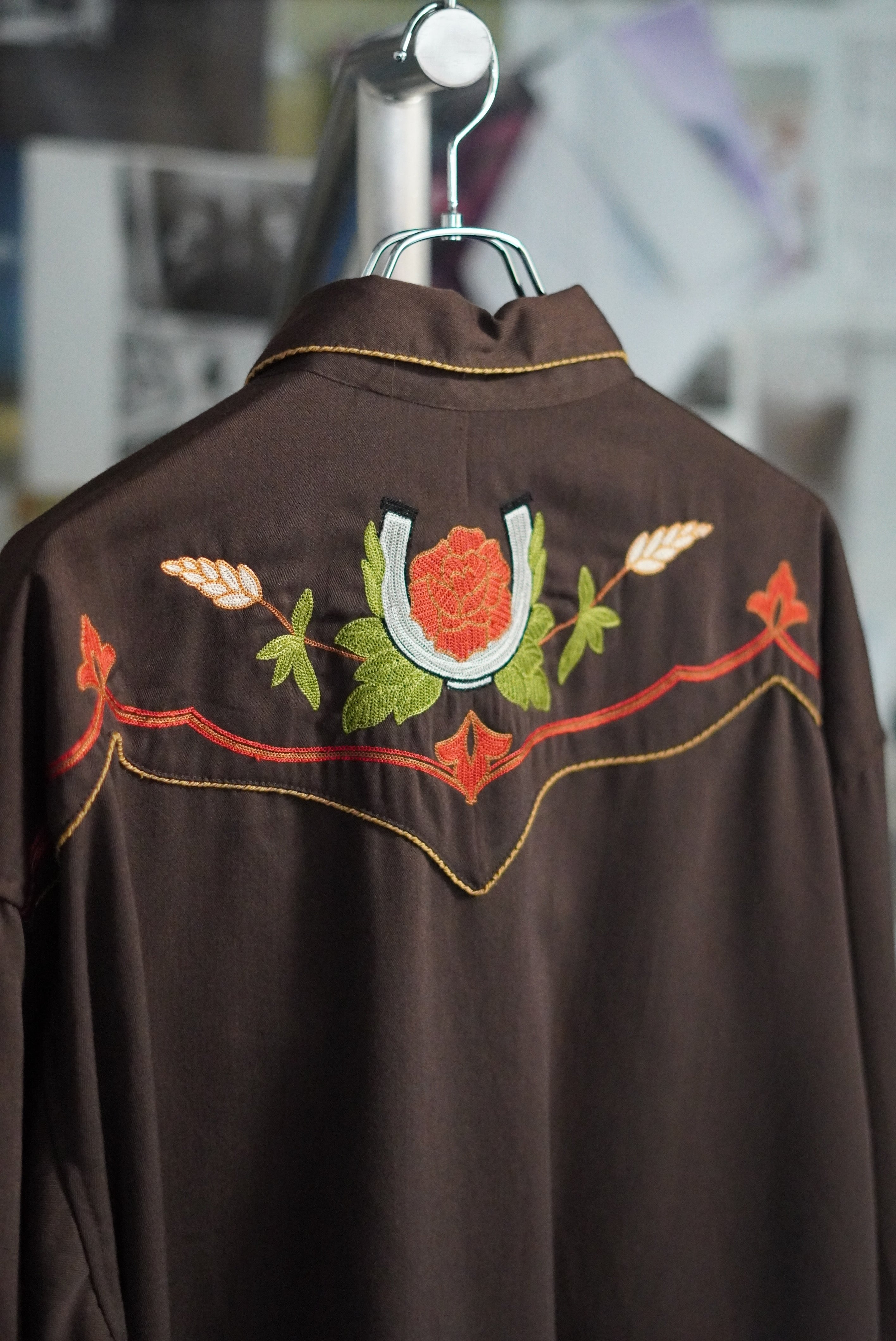 クラシックなウエスタンシャツのシルエットに、馬蹄とホースヘッド、そして大胆なフローラル刺繍が施された一枚。アメリカン・カントリーの魂をそのまま縫い込んだようなディテールは、ただのシャツではなくストーリーテラー。ビンテージウェアとしての存在感と、モダンファッションへの適応力を兼ね備えています。