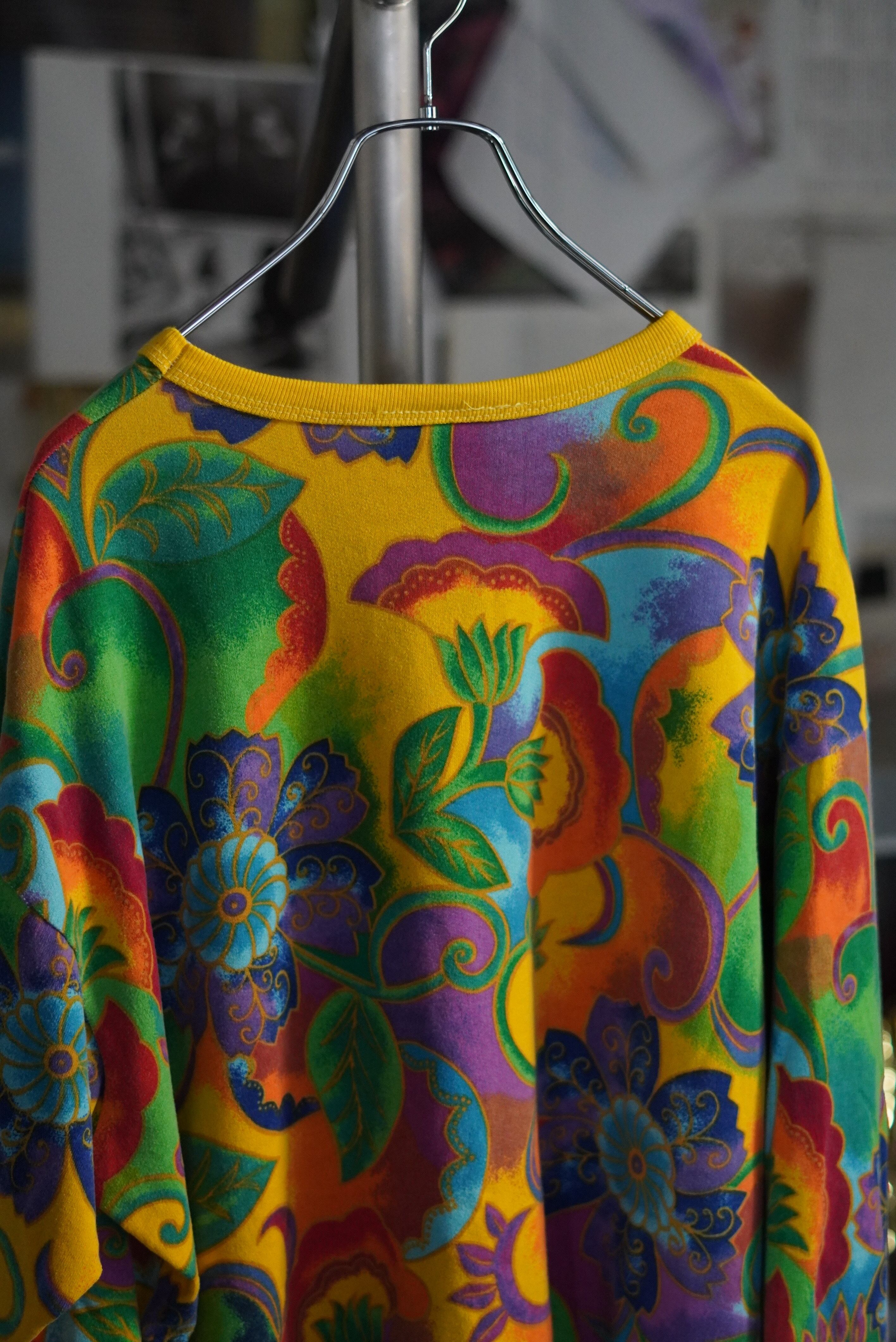 一目で心を奪う80年代製のロンTとスウェットの中間の様なアイテム。サイケデリックな色彩と曲線、咲き乱れる大輪の花たちが、視覚に訴えるトリップ感を演出。プリントというより“体感”に近いインパクト。大量生産品では出せない、時代の熱と自由な空気が詰まった一枚。