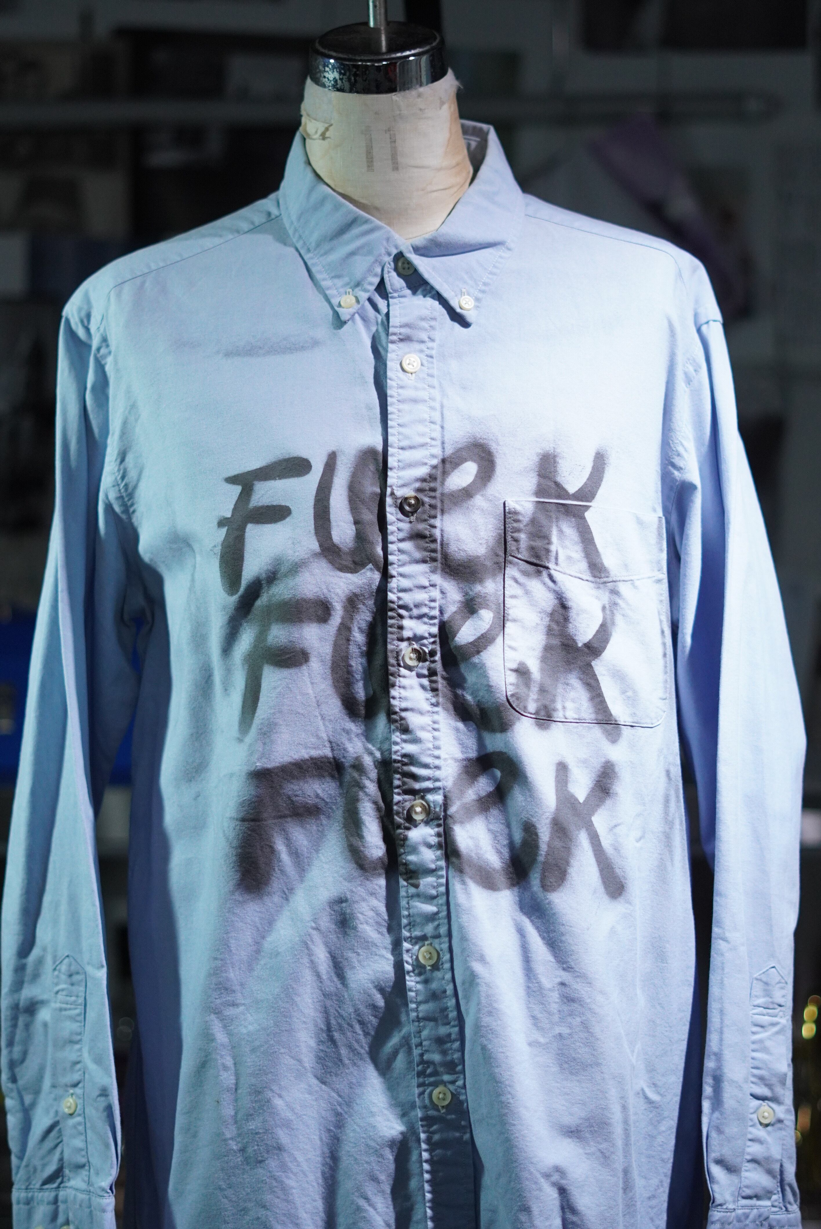 淡いライトブルーのボタンダウンシャツに、スプレーで荒々しく刻まれた「FUCK」の文字。3段重ねでリズミカルに配置されたそのフォントは、怒り、ユーモア、アイロニー、すべてを飲み込んだストリート・アートのような存在感。ちなみにあの大人気テーマパークのフォントを使用。既製品にはない、ピースとしてのエネルギーを持った一枚です。