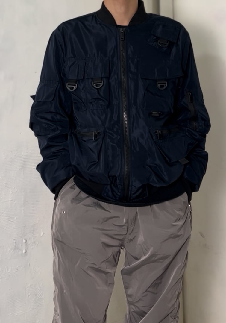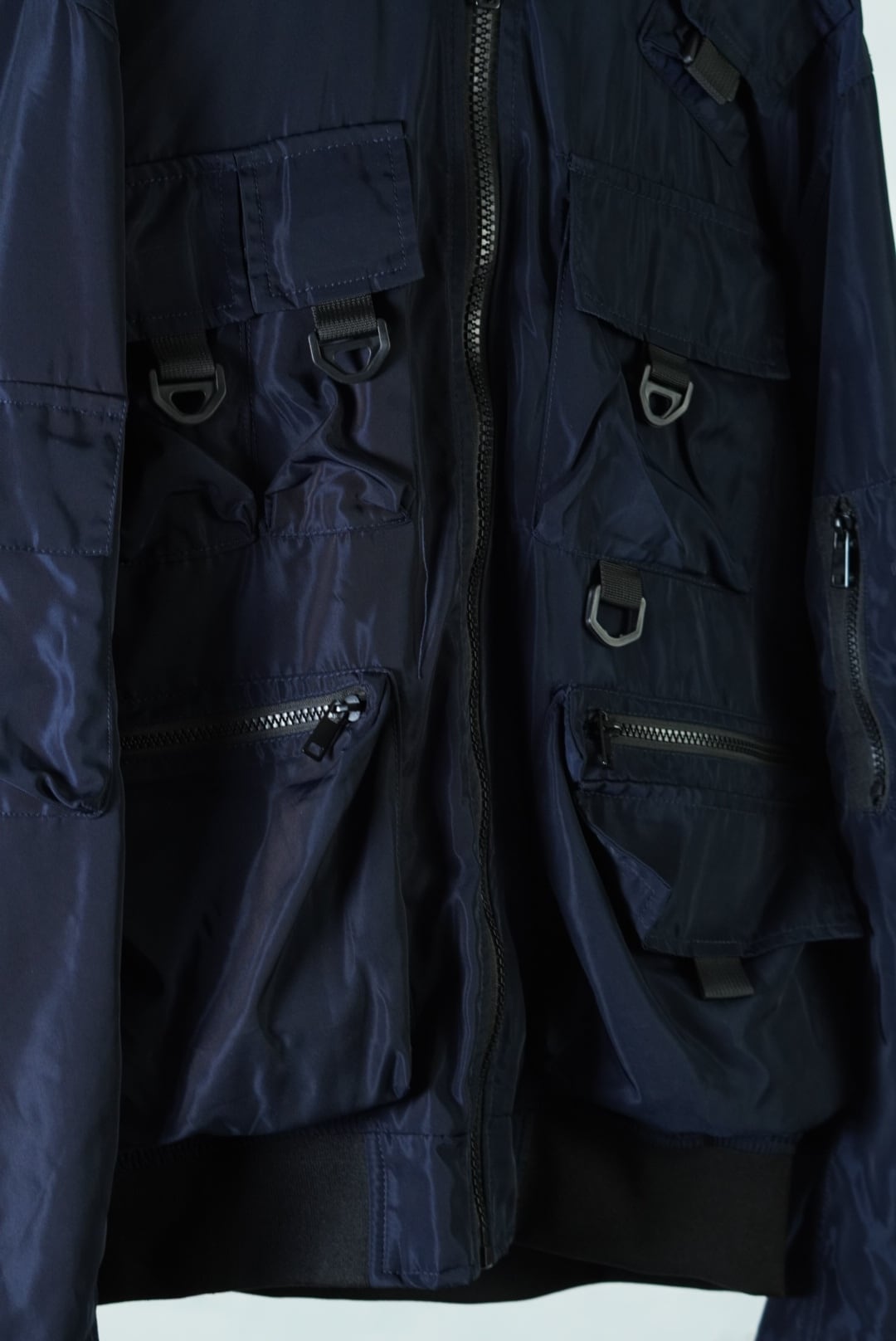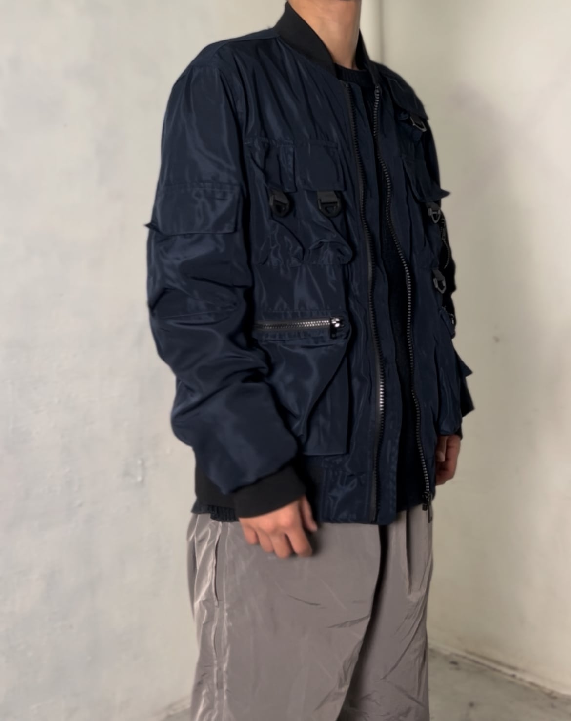 存在感のあるマルチポケットが印象的なダークネイビーのMA-1タイプのブルゾン。