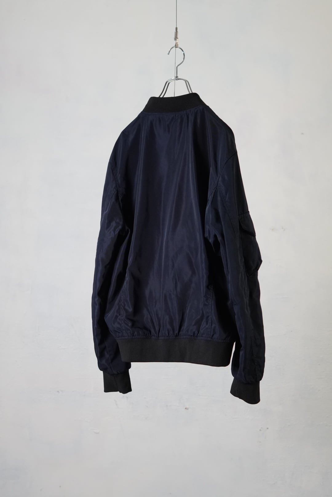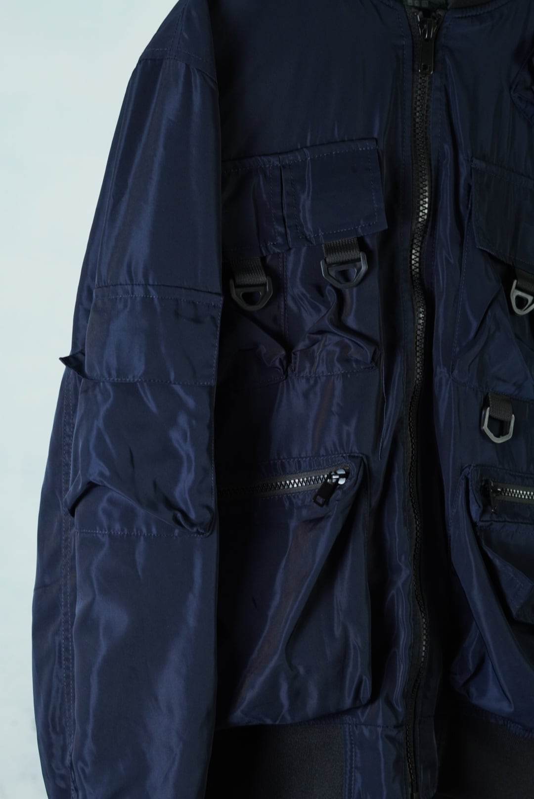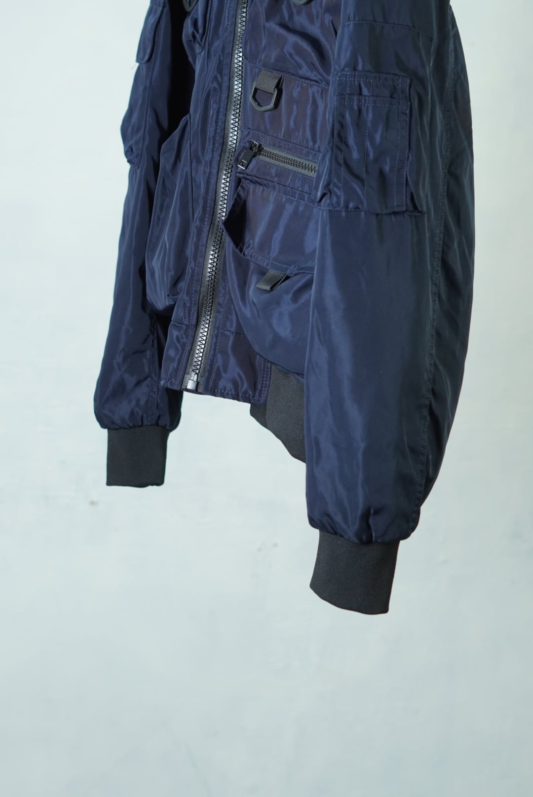 存在感のあるマルチポケットが印象的なダークネイビーのMA-1タイプのブルゾン。
