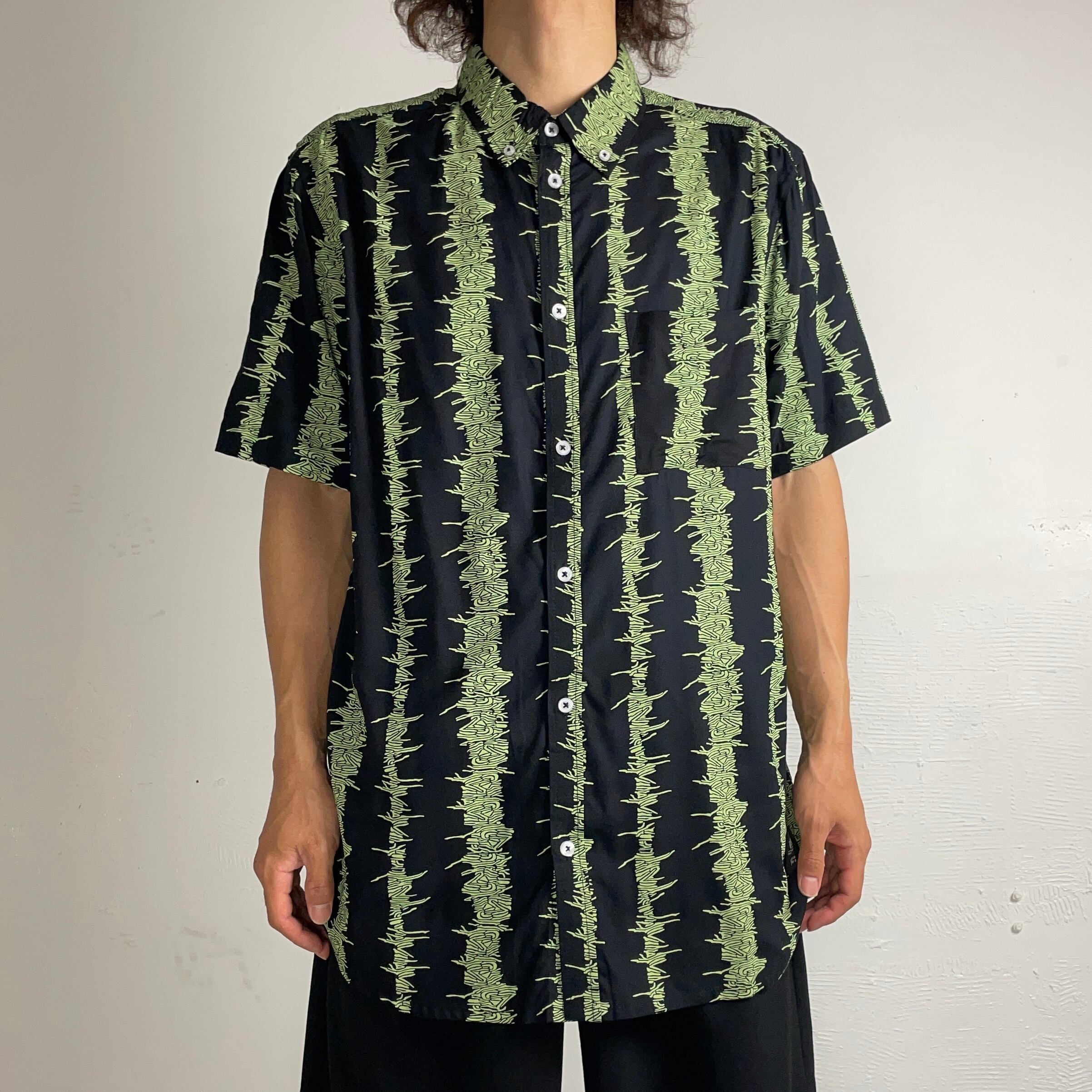 有刺鉄線のようなグリーンの柄がモードな雰囲気のシャツです。