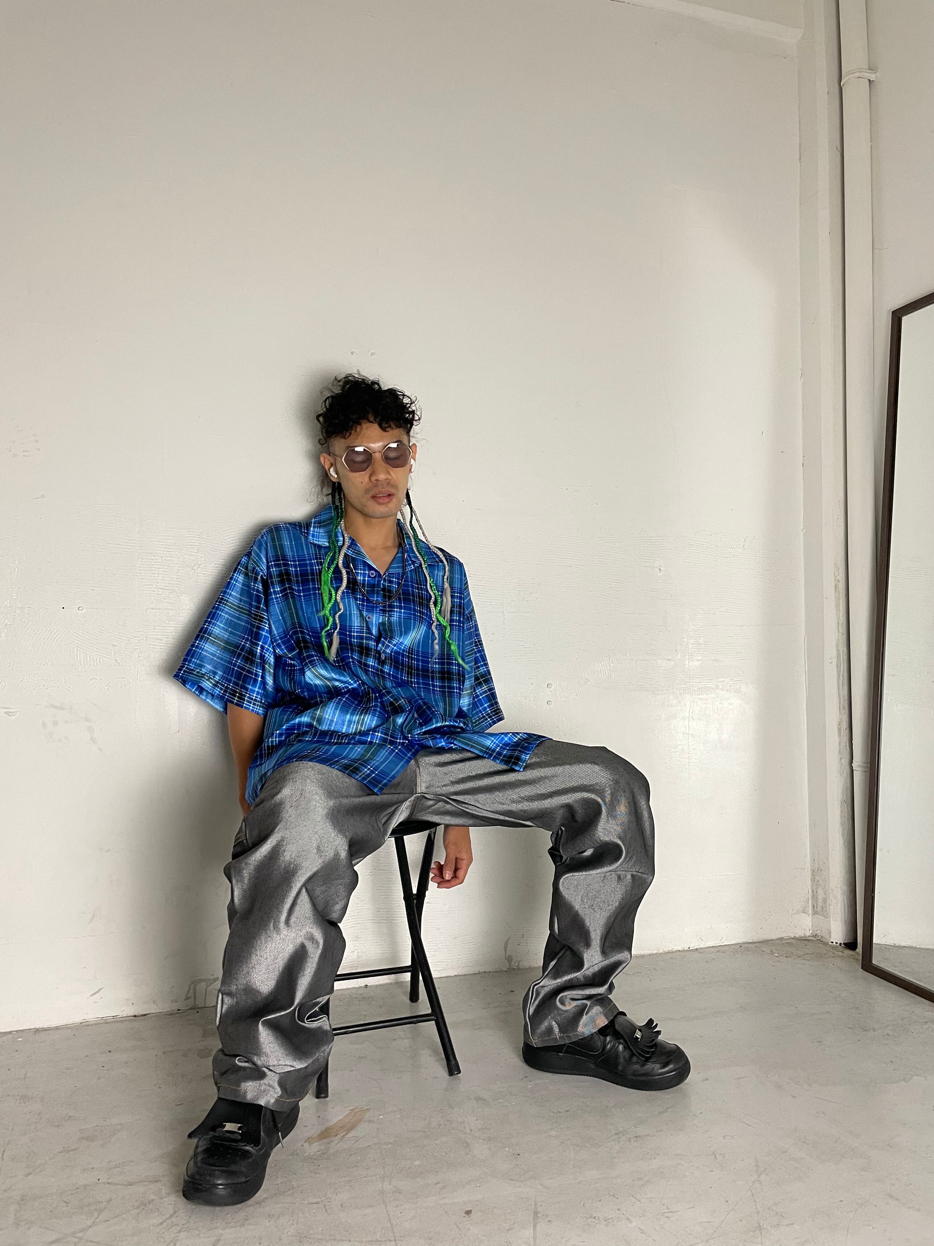 光沢のある生地を使用した珍しいブルーチェックシャツ