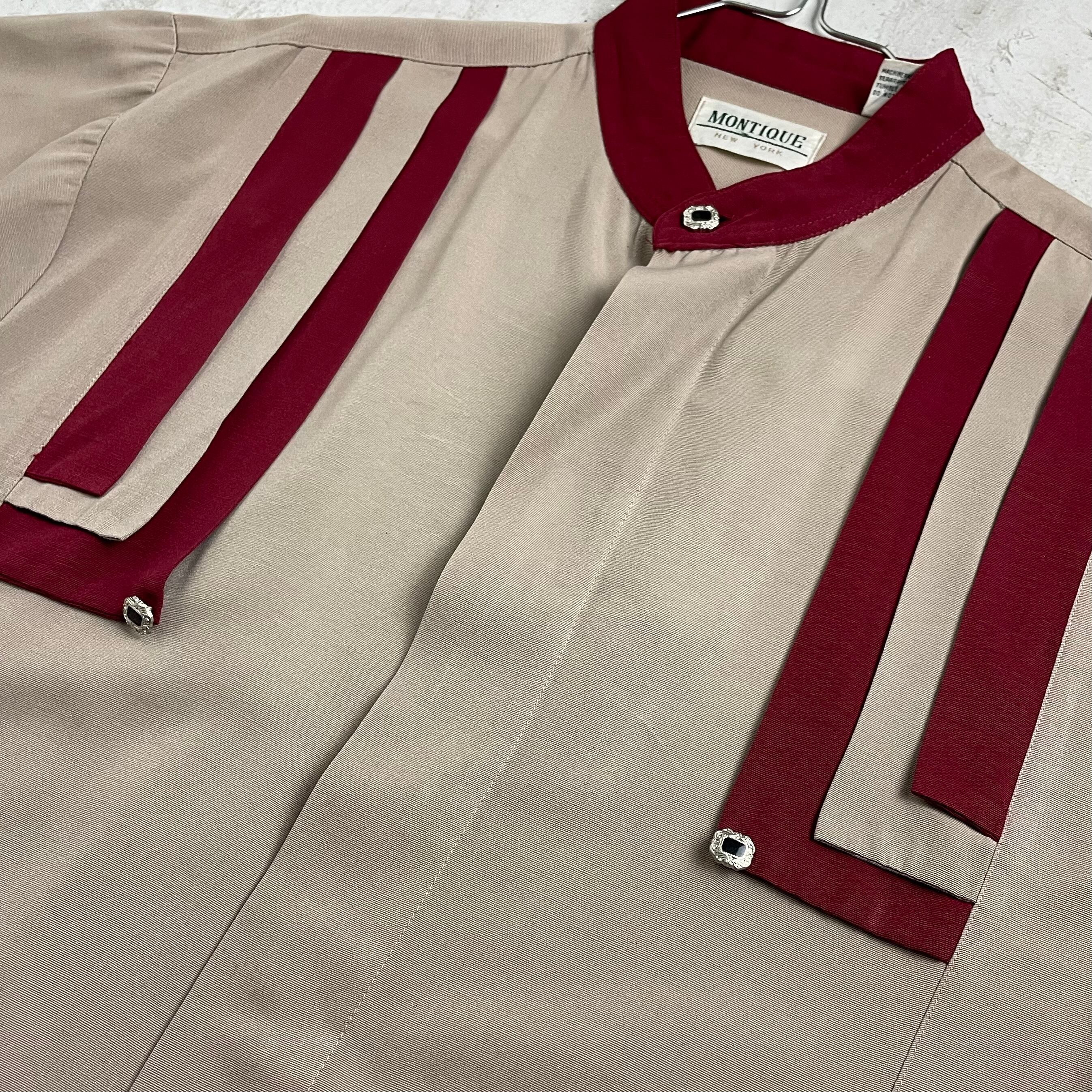 レーヨンとポリエステル素材のテロっとしたスタンドカラーシャツ