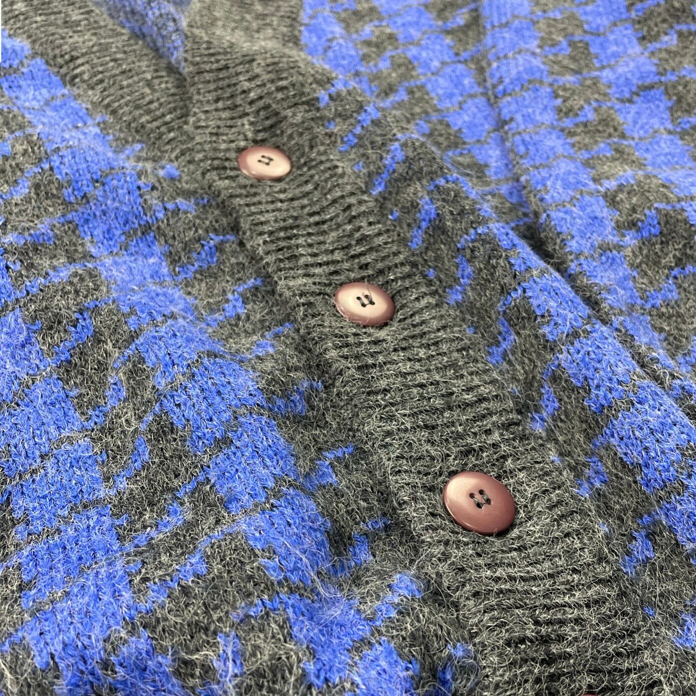 チャコールグレーと鮮やかなブルーがどんな合わせ方でも映える素晴らしいカーディガン