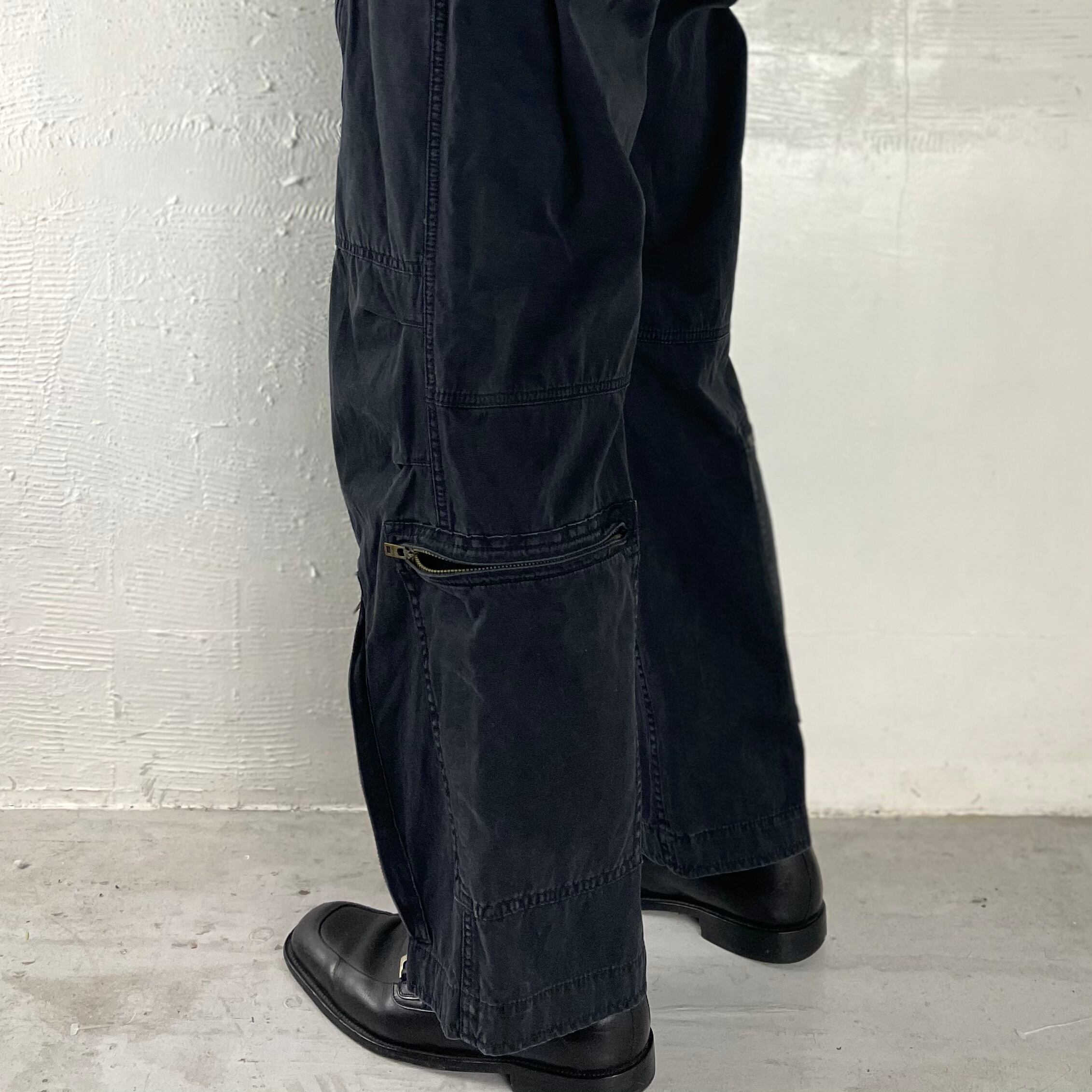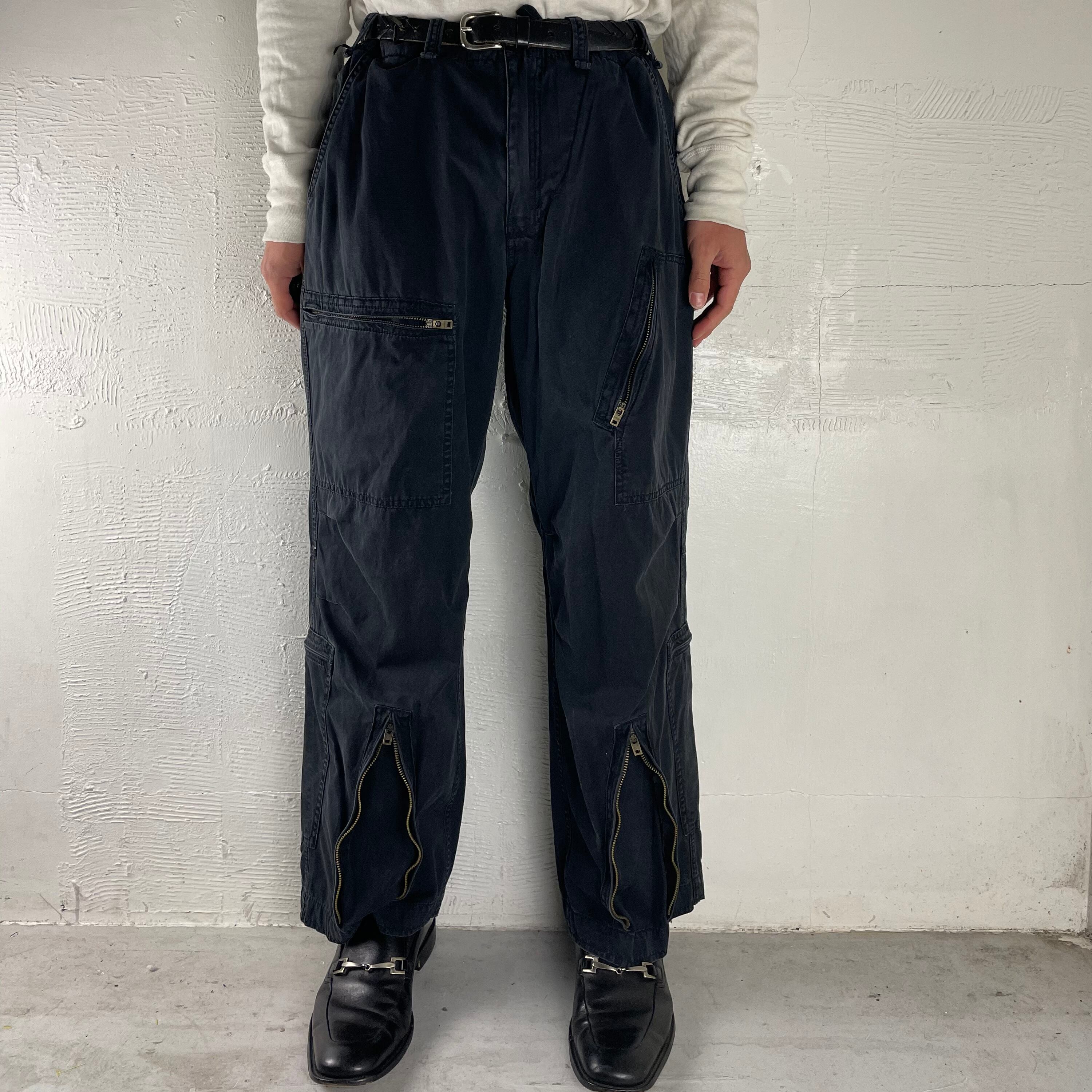 フロント部分のジップを開閉する事により裾がワイド仕様になりややフレアシルエットになり、ブーツなどを履く際にも実用的。