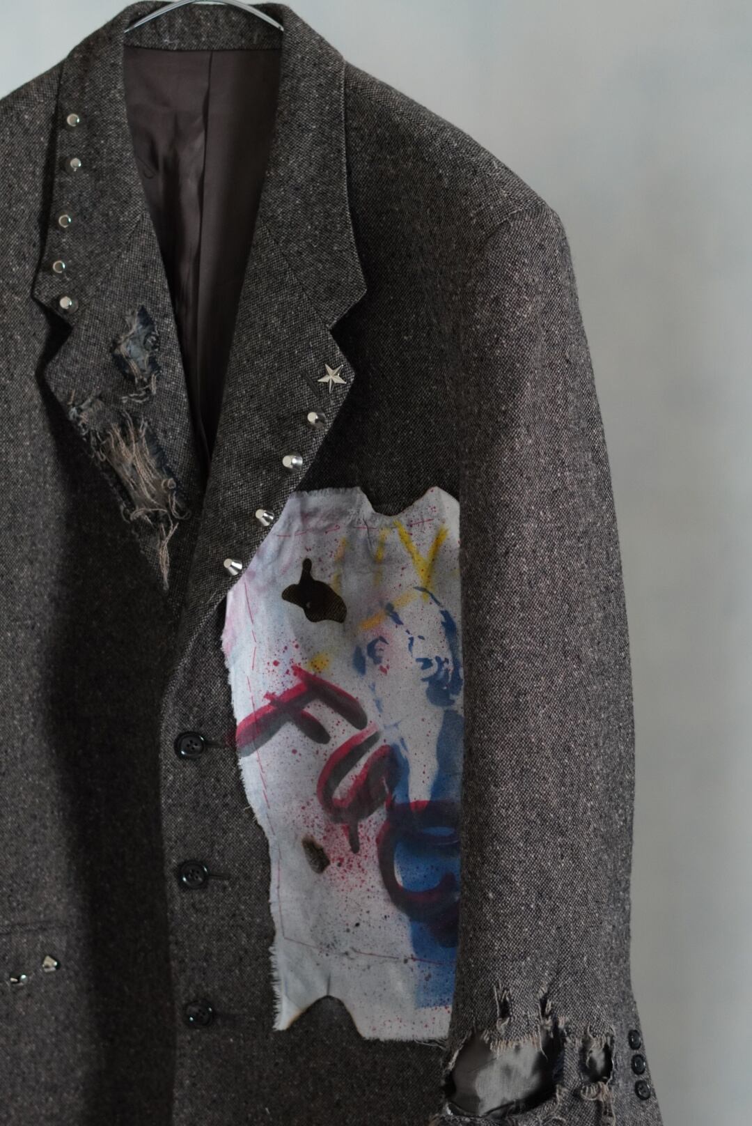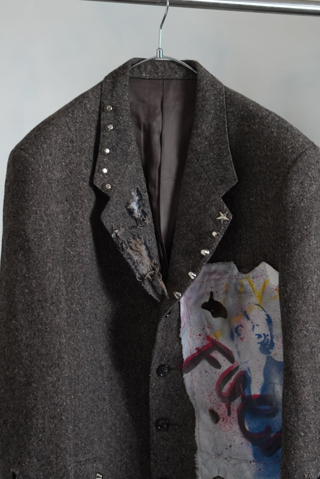 伝統のクラフツマンシップを誇るドネガルツイードをキャンバスに、パンクとアートが交差する唯一無二のテーラードジャケット。アイリッシュツイード特有のネップが生む豊かな表情に、意図的なダメージ加工、ハンドペイント、ヴィンテージファブリックのコラージュが施され、クラシックなジャケットの概念を打ち壊す大胆なアプローチが光る。
