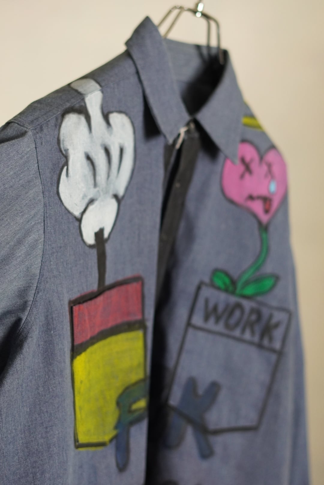 アートとワークウェアが融合した、ハンドペイントによる唯一無二のワークシャツ。グラフィティのようなペイントとステンシルワークが施された、まるでストリートアートのような一着。ヴィンテージワークシャツの無骨な雰囲気に、アナーキーなグラフィックをミックスすることで、ファッションとしての強烈な個性を確立している。